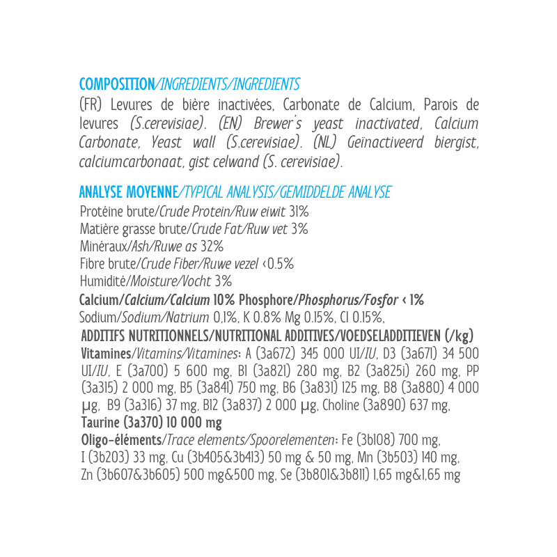 It also contains taurine in case the meat is overcooked or from can (as taurine is destroyed by heat), as well as yeast wall, source of Manno-Oligo-Saccharides and beta-glucans, for better digestive comfort and resistance.