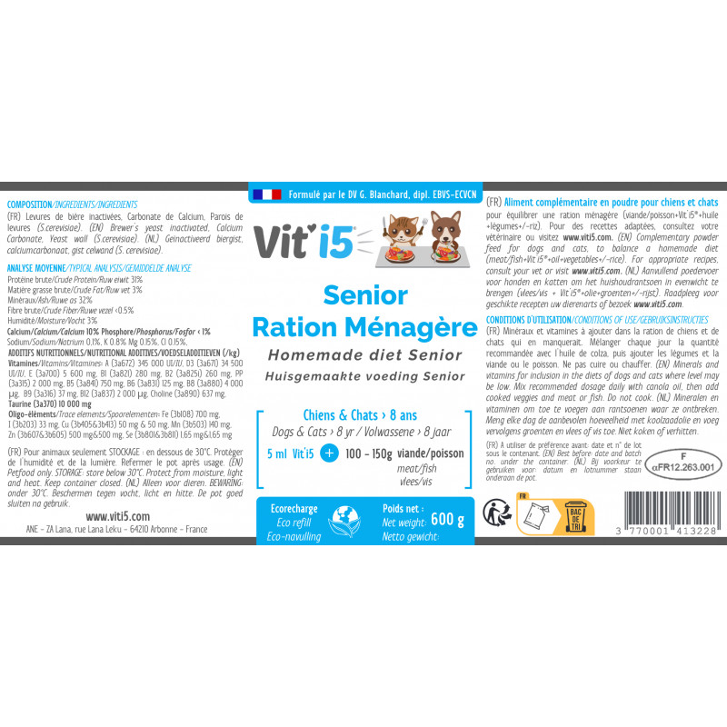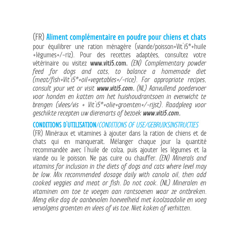 It is the only supplement with calcium, vitamins and trace elements (and no added phosphorus,only those naturally present in brewer’s yeast) formulated to balance a homemade diet (meat / fish + Vit’i5 Blue + rapeseed oil + vegetables +/- carbohydrates +/- dairy +/- treat) for the followings