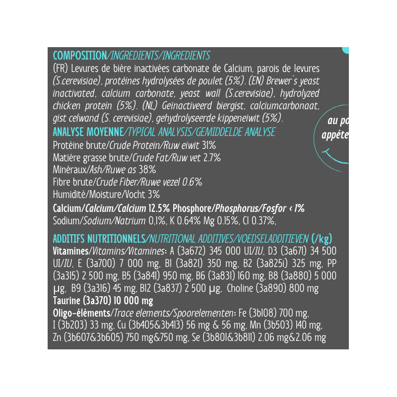 En poudre, arôme poulet très appétant, facile à doser (dosette incluse).