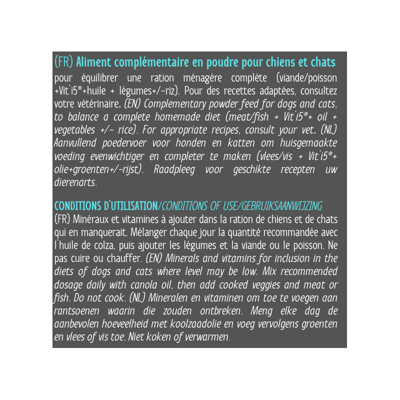 (viande+Vit'i5+huile de colza+légumes+/-féculent)